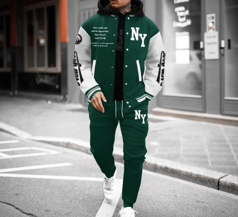Ensemble veste de baseball imprimée | cardigan à boutons-pression + pantalon décontracté à poignets élastiques